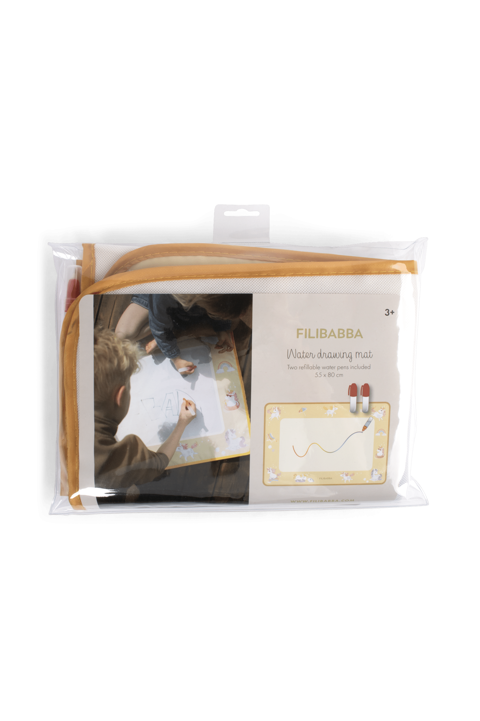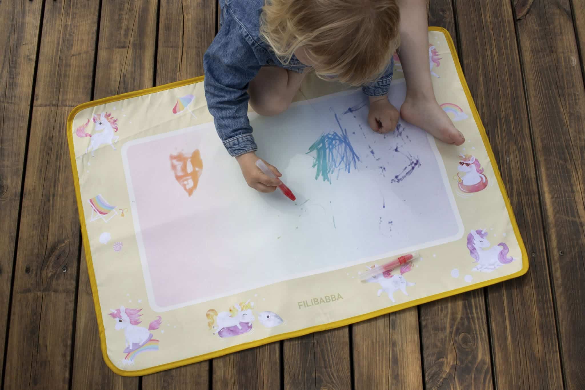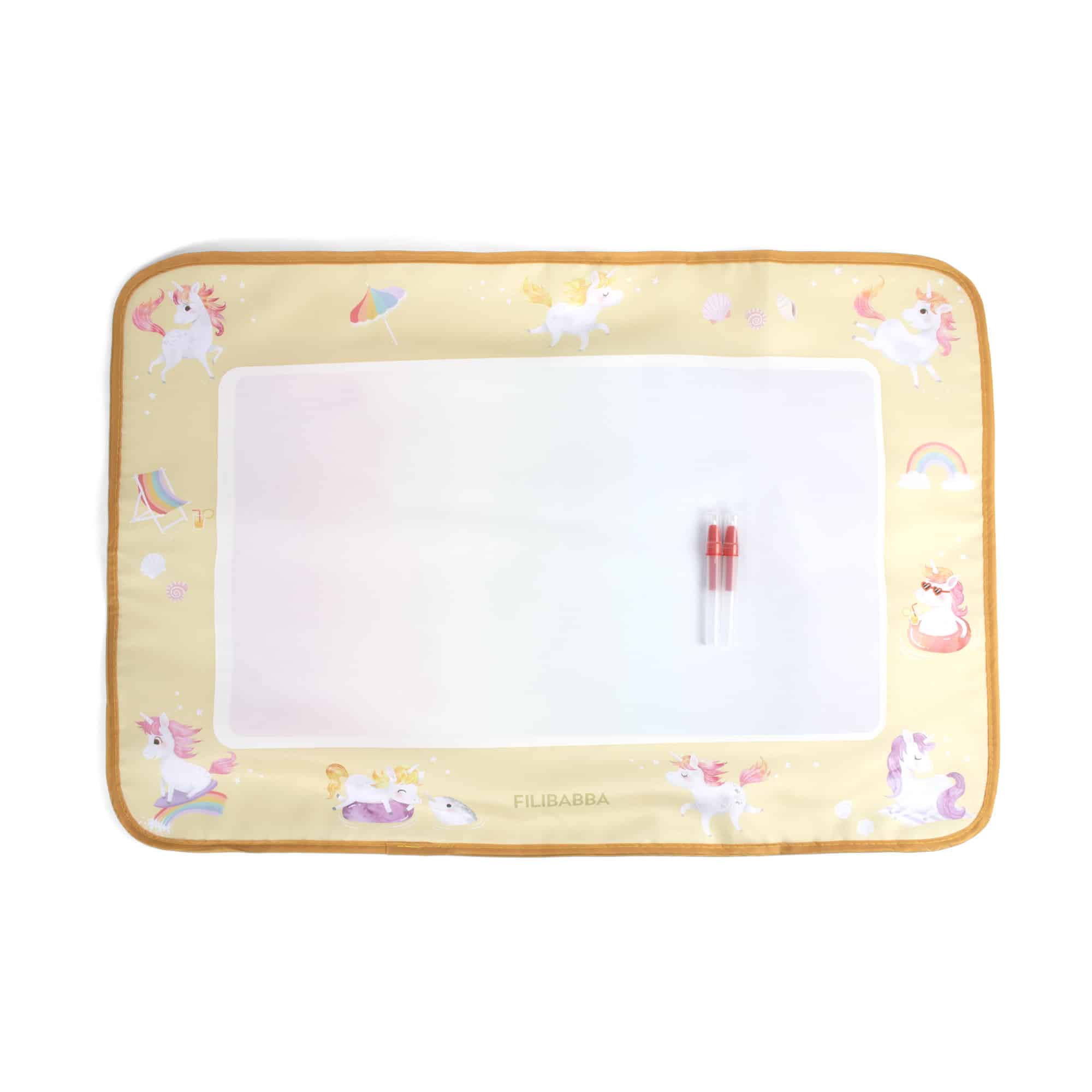 Tichý moment, jemný dotyk vody – a zrazu farby rozkvitnú ako mágiou. Táto snová vodná maliarska podložka umožňuje malým umelcom sledovať, ako ich fantázia ožíva v jemných dúhových odtieňoch – bez neporiadku a škvŕn. Nie sú potrebné farby ani fixky – stačí naplniť jedno z dvoch priložených pier vodou a sledovať, ako sa farby objavujú. Pokojný a hravý spôsob, ako objavovať kreativitu stále dookola. Podložka je dostatočne veľká na to, aby na nej mohli kresliť dve deti naraz. Keď kresba uschne, povrch je opäť pripravený na nové umelecké dobrodružstvá. Je ľahká a jednoducho skladateľná s praktickým popruhom – ideálna na doma aj na cesty, od obývačky až po slnečný piknik. Objavte tento čarovný vzor. Očarujúce jednorožce sa kĺžu po dúhach a jemne tancujú medzi vlnami, zatiaľ čo zvedavý malý narval vykukuje z trblietavého mora. Na jemnom žltom pozadí sa rozvíja snový letný svet plný fantázie a úžasu. Základné vlastnosti: