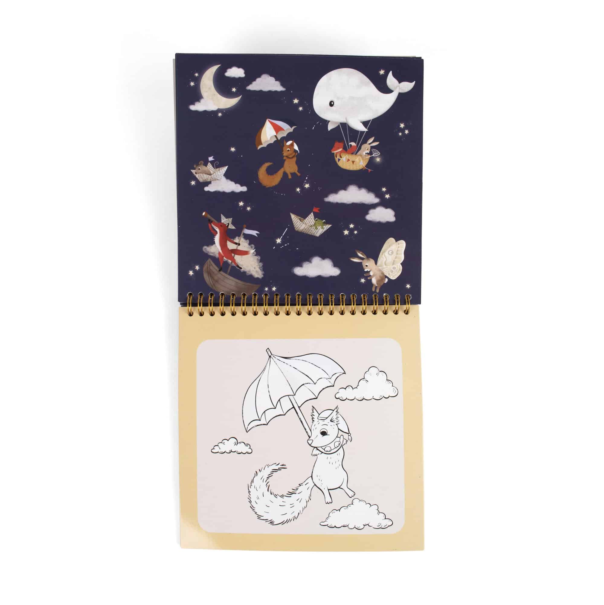 Každá stránka obsahuje kúzelné ilustrácie z kolekcie Dreamy Adventurers – rozprávkové zvieratká, žiarivé hviezdy a snové balóniky vo svetle hviezd, ktoré pozývajú deti tvoriť, objavovať a snívať.