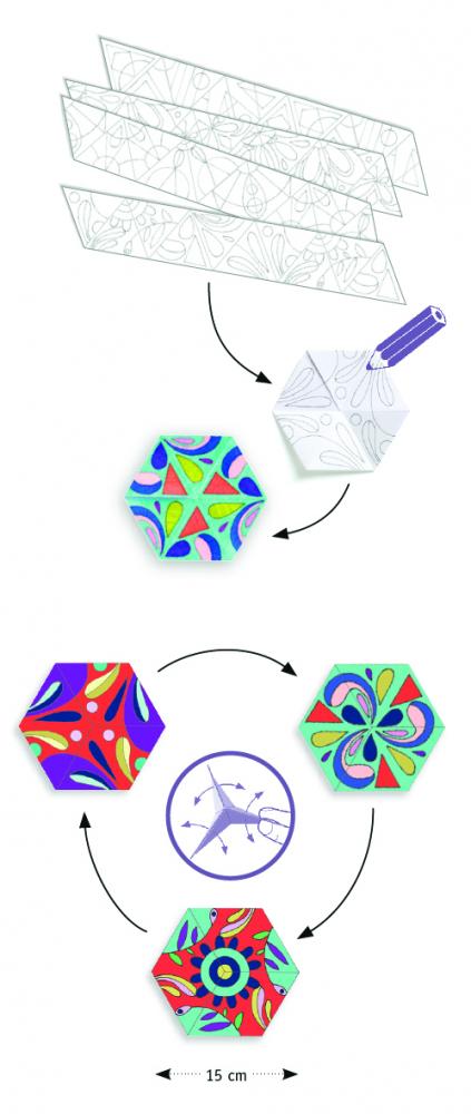 Sada Ružicové mandaly v sebe spája vyfarbovanie, skladanie a hru. Obsahuje 4 papierové prúžky so vzormi na vyfarbenie. Vyfarbené prúžky poskladáš do šesťuholníka, ktorý má farebnú nielen vrchnú a spodnú stranu, ale aj vnútornú. Zatlačením jednotlivých častí šesťuholníka k sebe a ich následným otvorením (prevrátením) sa ukáže ďalšia strana šesťuholníka – ďalší obrázok. Premieňanie obrázkov pripomína hru s kaleidoskopom. Tak ako je pre mandaly typické, sú obrázky na šesťuholníkoch symetrické. Keď sa ti podarí súmerne usporiadané geometrické tvary precízne vyfarbiť, budú tvoje ružicové mandaly dokonalé. Odporúčaný vek: 6 - 9 Rozmery prúžka pre skladačku: 42 x 6,5 cm Rozmery hotovej skladačky: 15 x 15 cm Rozmery balenia: 22 x 23 cm