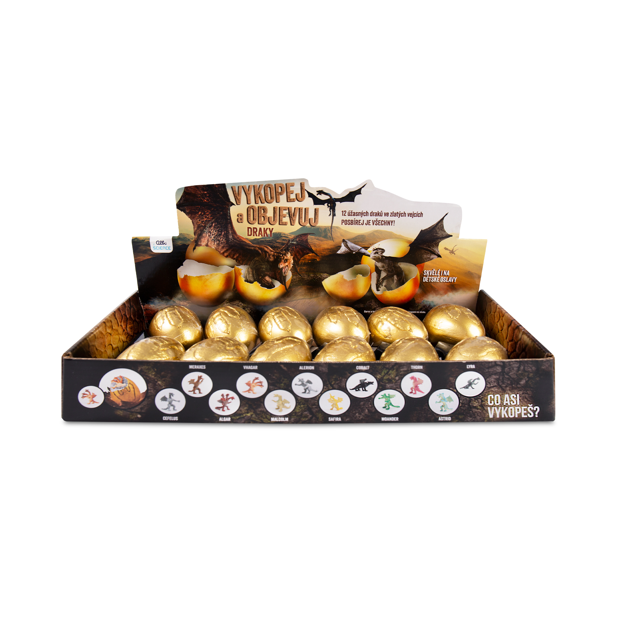 Jedinečná sada Vykop a objavuj - Draky od Albi Science skrýva 12 zlatých vajec s prekvapením v podobe dračích figúrok. Každá figúrka je úplne odlišná. Cena je uvedená za 1 ks vajcia. Sada Vykop a objavuj - Draky obsahuje: 12 sadrových vajec s figúrkami, 12 malých nástrojov.