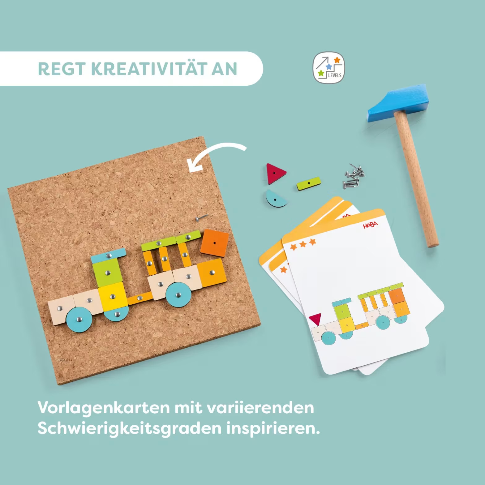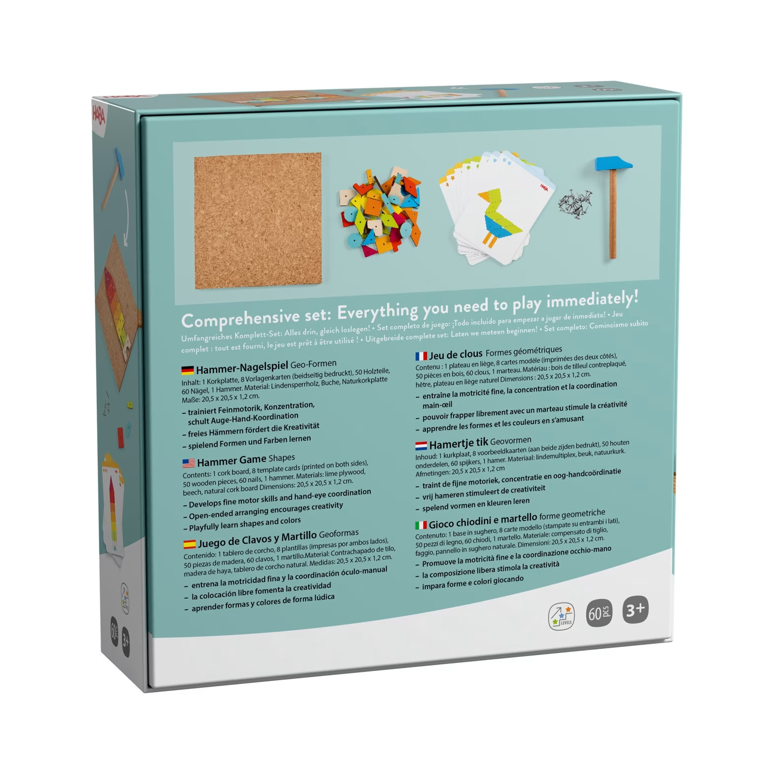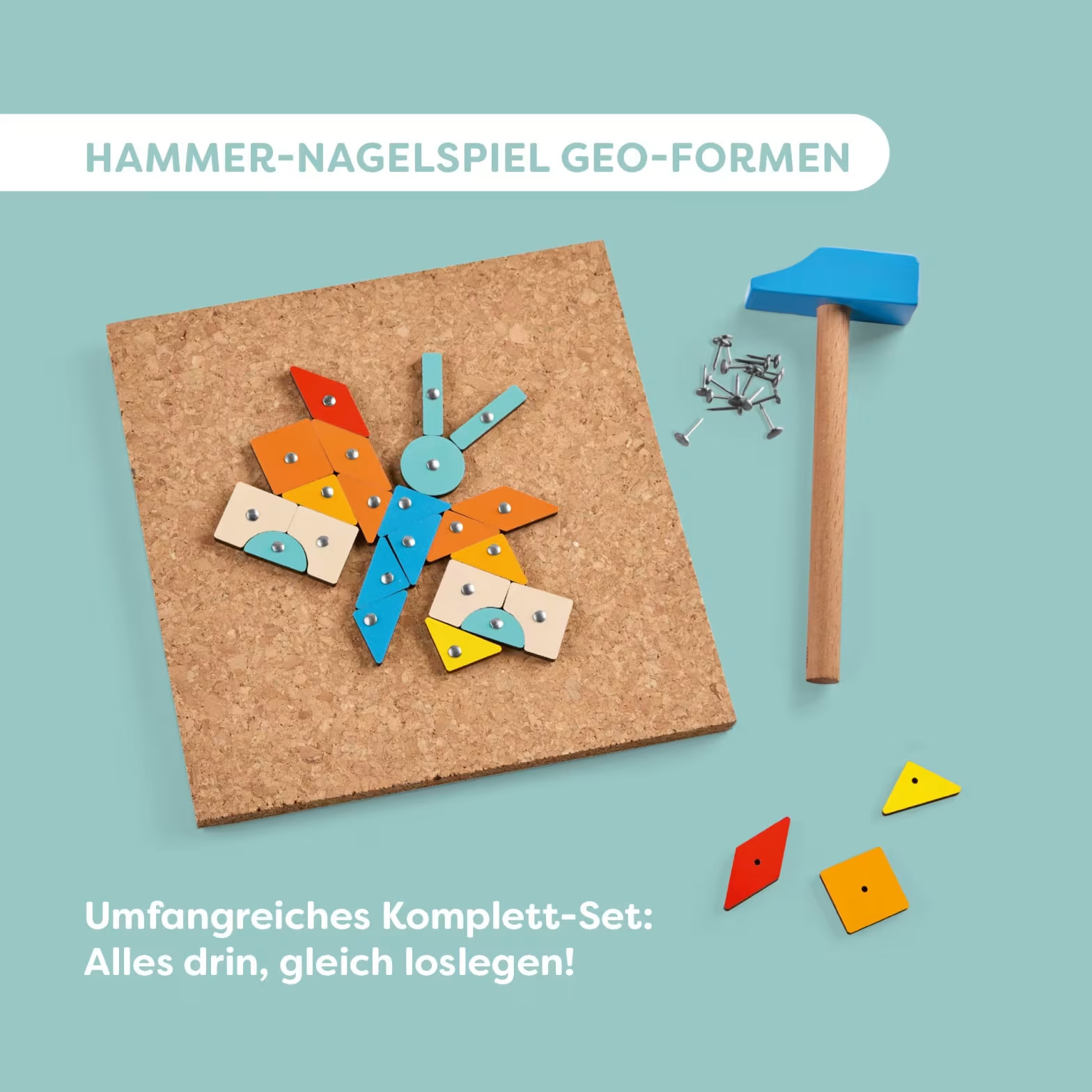 Set s geometrickými tvarmi je kreatívna hračka, ktorá malým tvorcom od 3 rokov otvára svet farieb, tvarov a konštruovania. Každý zabitý klinček je malým úspechom, ktorý posilňuje sebadôveru dieťaťa. Pomocou trojuholníkov, kruhov, obdĺžnikov a ďalších tvarov vznikajú pestrofarebné zvieratá, rastliny aj dopravné prostriedky – buď podľa predlohy, alebo úplne slobodne podľa vlastnej fantázie. Voľné hámrovanie bez predlohy rozvíja kreativitu a predstavivosť. Kľúčové vlastnosti: Kompletný set vrátane kladiva a klinčekov 8 predlohových kariet potlačených z oboch strán v 3 stupňoch obtiažnosti Rozvíja jemnú motoriku, koncentráciu a koordináciu oka a ruky Hravou formou učí tvary a farby Vek 3+