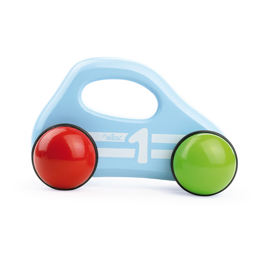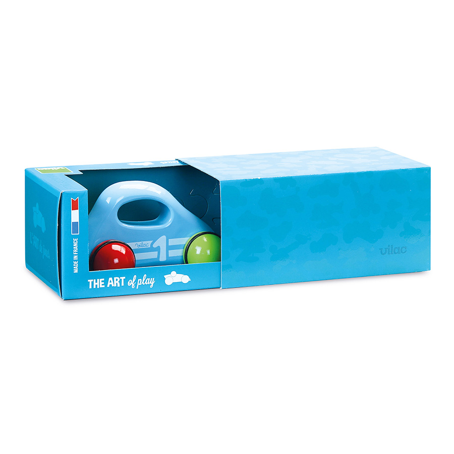 Modré závodné auto špeciálneho dizajnu, vyrobené z lakovaného dreva s štvorfarebnými pogumovanými kolesami. Je vhodné ako na hranie tak ako dekorácia do izieb detí či dospelých. Vyrobené vo Francúzsku. Hlavné vlastnosti: vyrobené vo Francúzsku